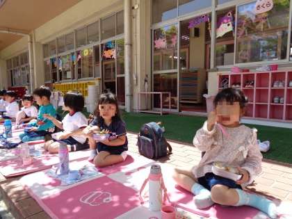 今日はとてもいい天気で暖かかったので、テラスでお弁当を食べました。さくら組になってからは初めて保育室の外で食べたのでとてもわくわくしながら準備をしました。お箸を持つ手と反対の手でお弁当箱を持ち、こぼさず上手に食べることができていました。