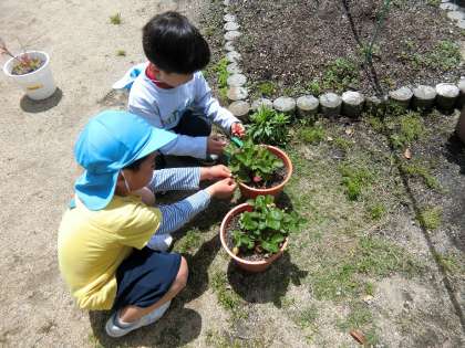 園庭で育てているいちごが真っ赤になっているのを発見!