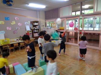 朝から保育室の上の方にスズランテープを張っておくと、「これで何をするの?!」と、子どもたちは興味津々。「今日は雨だからお部屋で遊ぼうと思って、これを持ってきたんだ!」と風船を見せ、スズランテープにつるすと…、「届くよ!」「見てみて!」とジャンプをして風船にタッチをする子どもたち。両足で力強くジャンプをしていました。近くにソフト積み木があり、それを持ってきて台にし、乗ってからジャンプする子どもたちもいました。「どうしたら届くかな?」と考えて遊んで楽しそうでした♪ ソフト積み木を並べて道にして、両手を広げてバランスをとる遊びも出てきました。