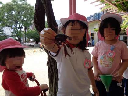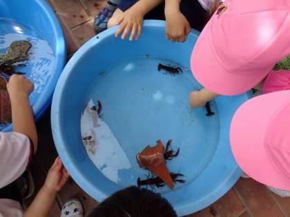 幼稚園にザリガニがやってきました♪子どもたちは、大きなハサミにびっくりしながらも興味津々。じっくり見たり、ハサミに気を付けながら触ったり持ったりし、ザリガニに関心をもって楽しんでいました。