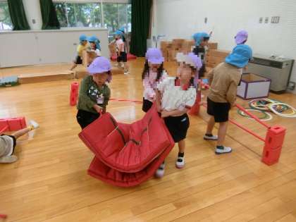 今日は雨が降っていたので、ゆり組、ふじ組で遊戯室で遊びました。