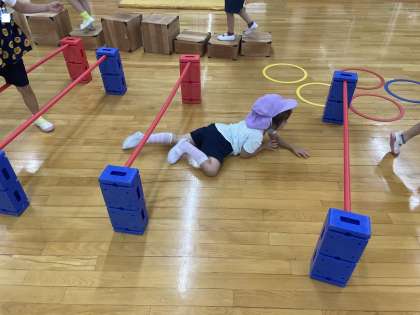自分たちで考えた道が出来上がると、自分がやりたいと思うところで遊び始めました。ジャンプしたり、バランスをとったりしてどんどん道を進んでいきます。途中から面白い動き方をしている子どもが出てきました。ジャンプしていた棒の下を匍匐前進したり、背中をつけて仰向けで進んだり、斜めになっている二本橋を四つん這いや逆四つん這いで渡ったりしていました。「そんなやり方もあるの?!」と子どもたちの柔軟な発想に驚かされました。