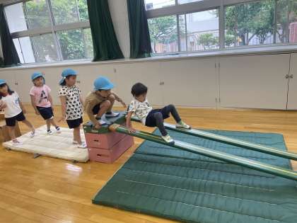 保育室に帰って遊びの振り返りをすると、自分がやったやり方を紹介したり、次は傾斜をもっとつけて難しくしたいなど、いろいろな考えが出てきていました。またみんなでいろいろと考えたことをやってみましょうね。