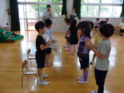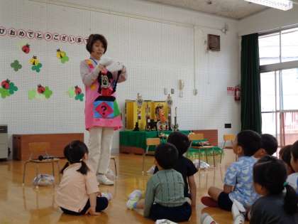園長先生からはエプロンシアターのプレゼントがあり、「ケーキだ!」「うわぁ!大きくなった!」と面白い仕掛けに興味津々の子どもたちでした。