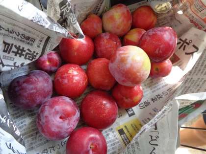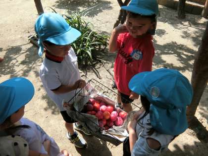 高い木に成っているスモモを事業担当主事さんにとってもらい手に取ると、「リンゴみたい!」「いい匂いがする♪」とわくわくしながら話していました。「赤い実があそこにあるよ」と木を見上げてみんなで探し、たくさん収穫できたので、幼稚園のみんなで1つずつ持って帰りました。