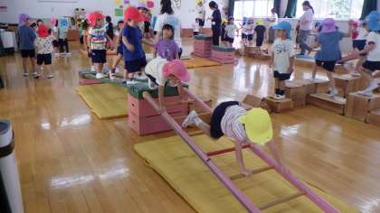 遊戯室には、巧技台や鉄棒、ゴム跳び、新聞ボールでの的当て遊びなどがあり、自分の好きな遊びを伸び伸びと楽しんでいました。自分なりの目標をもって、少し難しいことに挑戦し、先生に認めてもらってとても嬉しそうな姿がありました。年長児の真似をして難しいことに挑戦する年中児や、平均台を歩く年少児の手をもって付き添う年長児がおり、異年齢児がふれあい、互いに刺激を受けている様子が見られました。