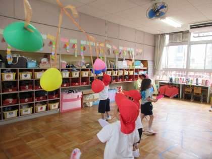 もも組の保育室では風船遊びを楽しんでいました。普通の風船やビニールテープを貼った風船、上から吊られた風船など、様々な風船がありました。吊ってある風船は、何回ついても戻ってくるので安心して遊べるようです。風船のふわふわした動きが面白く、落とさないようにポンポンついたり、友達とつき合ったりして遊んでいました。