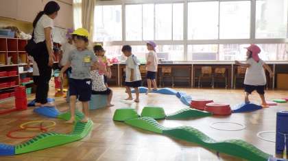 きく組の保育室では、バランス遊具をたくさん並べて道をつくり、自分なりにイメージを広げ、バランスを取って歩いたり、ジャンプしたりして遊んでいました。バランス遊具に凹凸がついており、靴下を脱いで歩くと足の裏が気持ちよく、何度も渡って楽しんでいました。