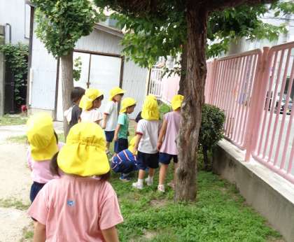朝から園庭では、セミが大合唱でした。「先生、セミの抜け殻一緒に探そう!」と子どもたちはやる気満々です。セミ本体ではないんだな…と思いつつ、園庭の木を探すと、たくさんついている木と、全然ついていない木があることを発見。「この木が好きなんかなー?」と言いながら、抜け殻捜索隊が増えていきました。すると、「先生!生きたセミの抜け殻見つけたー!!」と大興奮の子どもが。どうやら羽化する前のセミの幼虫だったのですが、『生きたセミの抜け殻』という言い方に、思わず笑ってしまいました。
