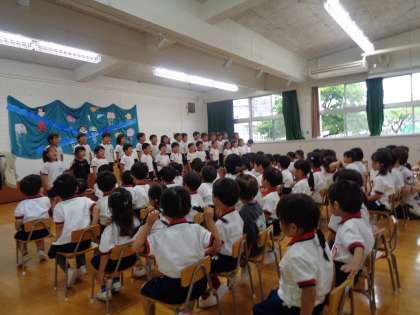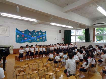 第1学期終業式を行いました。久しぶりに全園児と、保護者の皆様にも参加いただいての終業式が実施できました。夏休みの過ごし方を教員の寸劇により知らせる場面では、子どもたちから「夜は早く寝る!」「冷たいもの食べ過ぎたらあかん!」と声があがっていました。