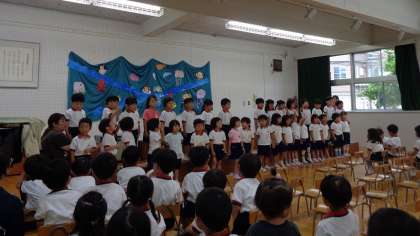 そのあとは、3歳児が「おつかいありさん」、4歳児は「プールのなかで」、5歳児は「ぼくのミックスジュース」の歌を披露しました。子どもたちも互いに歌を聞きながら口ずさんでいましたね。保護者の方にも聞いていただけてとっても嬉しそうでした。
