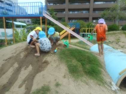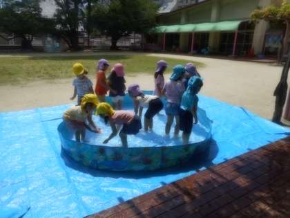 朝から暑い日が続いています。午前中は水遊び用の服に着替えて園庭へ…。