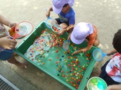 大きなビニールプールに足をつけて涼んだり、水鉄砲やスーパーボールすくい、泥んこ遊びなど、夏にしかできない遊びをお友達と一緒に楽しんでいます。午後はもっと暑くなるので、冷房の効いた遊戯室でゆったりと遊んでいます。