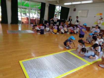 年長児も「負けないぞ!」と張り切っていました。一体どんな遊びをするのかは、当日を楽しみにしてくださいね。子どもたちは、「魔法のマットやー!」と言っていましたが…。どうなのでしょうか?