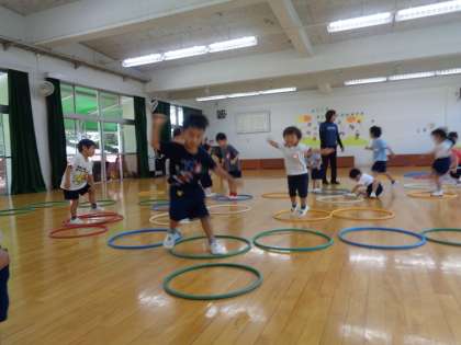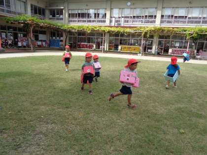 「運動会ってなんだろう」と思っている子どもたちもいましたが、運動会ごっこ(予行)では、年長さんや年中さんのお客さんに応援してもらったり、応援したりして楽しんでいました。