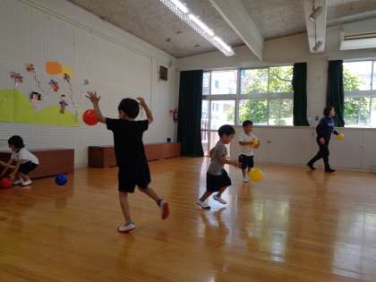 箱でつくった手作り電車を見つけると、子どもたちは「扉が閉まります」「だれか乗りますか?」と、電車ごっこを始めました。一人一台、自分だけの手作り電車に乗って、毎日遊んでいます。駅にとまったら、それぞれの駅にある運動遊具で遊びます。ボール駅やジャンプ駅で楽しそうに遊んでいる姿がとってもかわいいです。