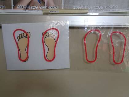靴には右と左があって、間違って履くと足の指はどうなっているのか? 右と左を正しく並べるにはどこを見ればいいのか? をイラストや上靴を使って伝えました。
