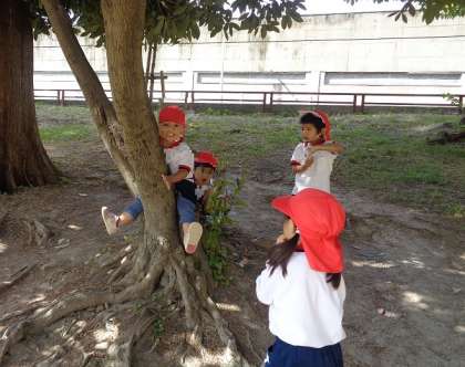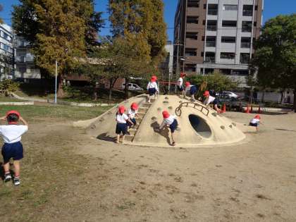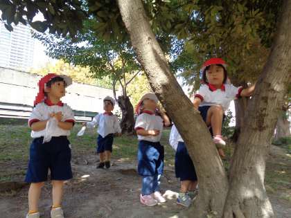 公園に着くと、「こっちにどんぐりの木があるねんで!」「いつもこの辺に落ちてるねんけどなぁ」と教師に知らせ、おうちの人と一緒に遊んでいる慣れ親しんだ公園であることが感じ取れました。幼稚園とは違った遊具で幼稚園のお友達と一緒に存分に体を動かしたり、自然に触れたりして、楽しい時間を過ごしました。