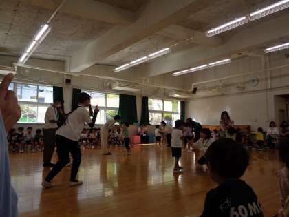 最後は運動会でも踊った『せかいはパラダイス』の曲に合わせてポンポンを持ってダンスをしました。運動会でも楽しく踊ったダンスは何度踊っても、心がウキウキしますね。みんなのポンポンが、クラスカラーのお花が咲いたように見えてきれいでした♪