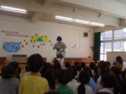 園長先生からは『三匹のがらがらどん』のエプロンシアターのプレゼントと、お皿のプレゼントがありました。大きなトロルが出てくる場面にドキドキしながらも楽しく見ている子どもたちでした。