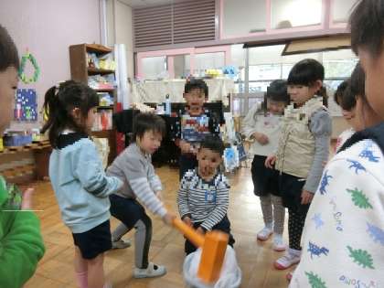 保育室にあるおもちつきごっこの道具を使い、明日への準備はばっちりです。「力いっぱいつくぞ!」とやる気満々の子どもたちでした。