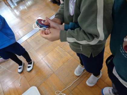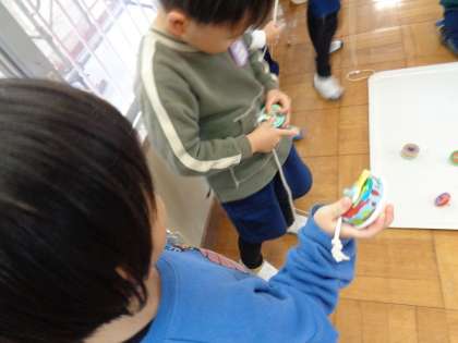 11月後半から、こま回しを楽しんでいます。しかし、なかなかひもがうまく巻けず、「できない…」と悲しそうなきく組の子どもたち。
