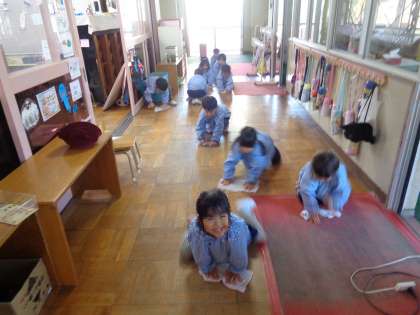 各クラスの保育室の中も靴箱もきれいにしました。保育室の床や廊下を雑巾がけし、「おっとっと!」と体のバランスをとりながら一生懸命掃除をしました。