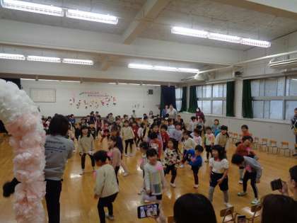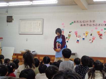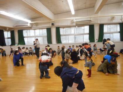 園長先生からのプレゼントは、『ブレーメンの音楽隊』のエプロンシアターでした。「ヒヒーン!!ワンワン!ニャーニャー!コケコッコー!」と動物たちが鳴くシーンで、子どもたちは大笑い! お家の人との遊びでは、カメのなったり、サルになったりして、ふれあいを楽しみました。最後はみんなで『おでんぐつぐつ体操』を踊り、ほっかほかの気持ちになりました。
