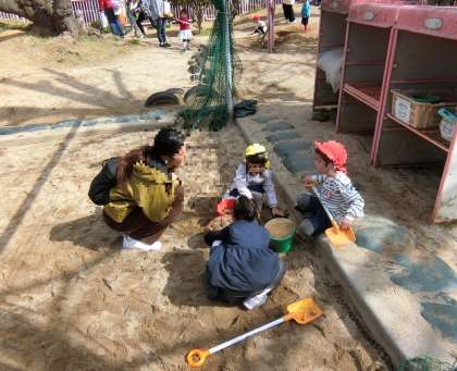 まずは園庭で、好きな遊びを楽しんでもらいました。砂場で園児と一緒に遊んだり、幼稚園にある遊具で遊んだりして楽しんでいました。