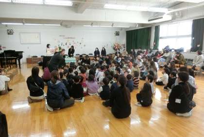 その後、遊戯室に入って、本園保護者の『わくわくえほんのくに』の方に大型絵本を読んでもらったり、年中児や年少児と一緒に歌を歌ったりしました。