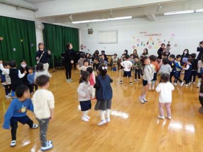 「よろしくね」のふれあい遊びでは、幼稚園のお友達と一緒に手をつないだり、タッチをしたりして楽しそうでした。