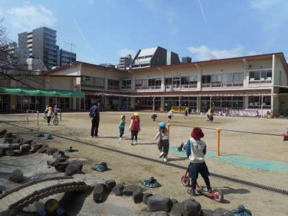 お天気の良い日は、朝から園庭へ…。年長児さんと一輪車をしたり、おにごっこをしたりして楽しんでいます。