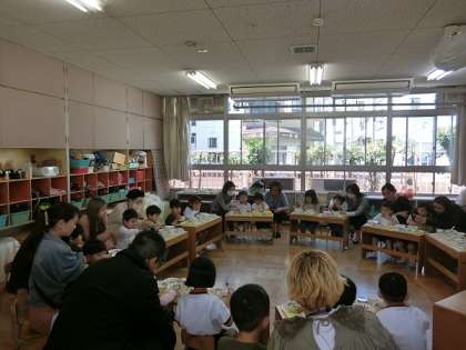 そして、いよいよ給食です!今日はカレーでした。3.4歳児の初めて参加する子どもたちは、お家の人にも食べる様子を見てもらいました。さっそくおかわりする子どももいたようです!