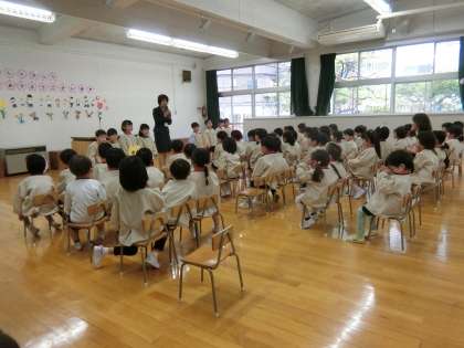 保育室に戻って、みんなでお話をしたり、手遊びをしたり、歌を歌ったりしました。「明日はお外で遊べるかな!」と、楽しみにしている姿もありました。水曜日から新しいお友達が増えることも楽しみにしているようです。