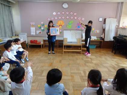 保健指導では、来週の年少組の発育測定に年長組さんがお手伝いに行くことから、「服の脱ぎ方・たたみ方」の話と、「手洗い・うがい」についての話をしました。