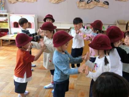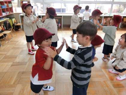 さくら組では、ふれあい遊びとして「♪ともたっち」をしています。ペアになって、手と手を合わせ「たっち、たっち、たっち!」と友達と音楽に合わせてタッチすることを楽しんでいます。