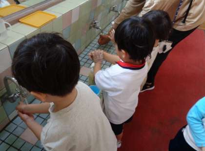 先日の保健指導で学んだ“あわあわてあらいのうた”にあわせて、登園後、外遊びやトイレの後、給食・お弁当前の丁寧な手洗いを継続しています。