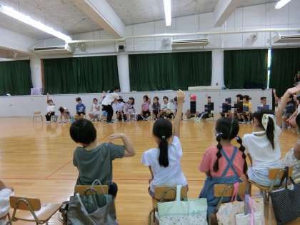 転勤や退職をされた先生方にもお越しいただき、楽しいひと時を過ごしました。「好きな授業はなに?」「休み時間は何をしているの?」「好きな給食のメニューは?」など1年生たちにいろいろインタビューををすると、元気な答えが返ってきました。“誕生月仲間”の曲で元気にスキップして遊び、園歌をみんなで歌いました。