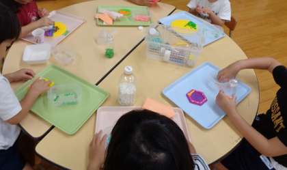 夏季休業中はお休みの友達がいたり、久しぶりのお友達がいたりと様々ですが、ゆったりと過ごしています。アイロンビーズが大人気ですよ! 水遊びや土粘土、寒天遊びなどの感触遊びも楽しんでいます。
