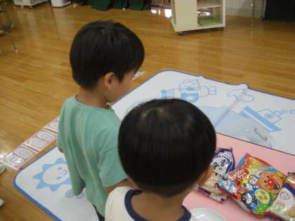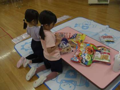 「今日はどれでも好きなおやつ2つ選んでいいよ」と言うと、「やったぁ!どれにしようかな?」とじっくり選んだり、「同じの食べよう」と友達と同じにしたりしていました。みんなで一緒に食べるおやつは美味しいですね。