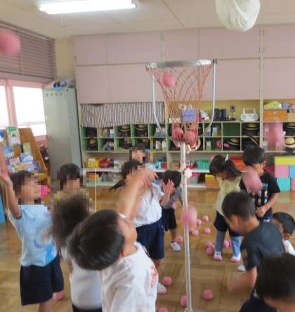 さくら組の保育室に、玉入れのかごと玉を置いてみると「うわ!玉入れや」「やってみたい」と、わくわくした表情の子どもたち。かごをねらって玉をたくさん投げていました。