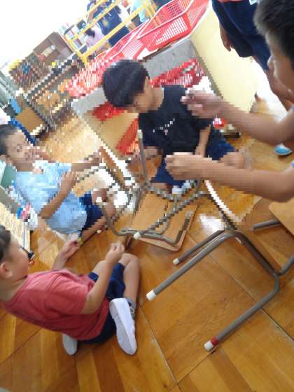 途中からもう一つずつ磁石を渡すと、磁石同士がくっついたり反発したりして、子どもたちは大喜び!「不思議!」「おもしろい!」「(反発する磁石を)どうしてもくっつけたい!」と夢中になって遊びました。一つの磁石を置いてもう一つを近づけると、「触ってないのに動くねん!」、2つの磁石で椅子を挟んで1つを動かすと触ってない方が動いて「魔法みたい!」。「なんでだろう?」「不思議だな」を感じながら、試して考えておもしろさを見つけて楽しんでいました。