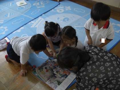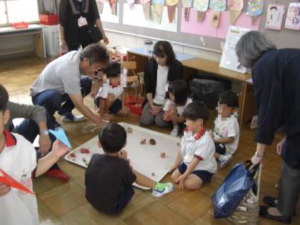 各クラスの保育室で、折り紙をしたり、絵本を読んでもらったり、こままわしやけん玉、お手玉などの遊びを昔遊びを教えてもらったりしました。