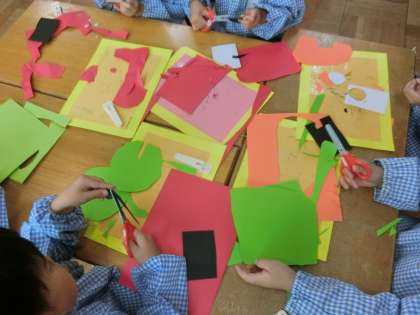 「何色にしようかな?」「口もつけたいな!」「ほっぺもつけたらかわいいかなあ」と、それぞれ工夫してつくっていました。