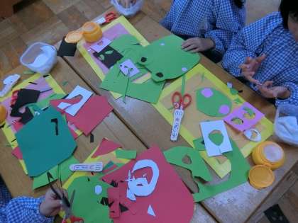 カエルやザリガニになって遊ぶことを楽しんでいる子どもたち。カエルになって高く跳んだり、大きなハサミを持ったザリガニになって歩いたりして遊んでいます。今日は画用紙を使ってカエルとザリガニのお面をつくりました。