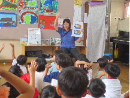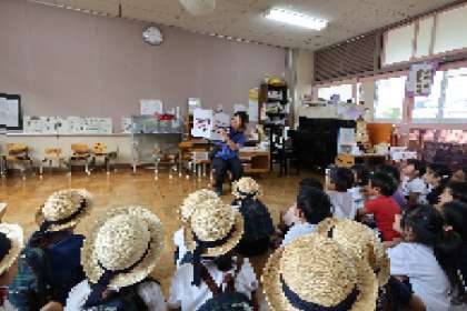 赤色の食品群は肉や魚などでみんなの体を大きくしてくれること、黄色の食品群はパンやご飯、芋類などで力が湧いてきて元気いっぱい過ごせること、緑色の食品群は野菜や果物で病気から守ってくれることを伝え、「もりもり大きくなって病気に負けず毎日元気に過ごすためには、3色バランスよく食べることが大事なんだよ」と伝えました。