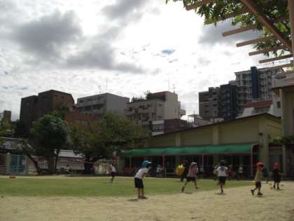 子どもたちは涼やかな風に吹かれながら園庭で戸外遊びを楽しんでいます。