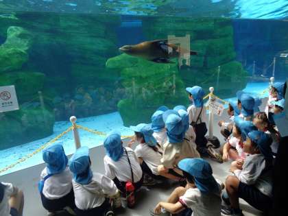 年少組さんは、電車に乗って行く初めての園外保育でした。年長組のお兄さん、お姉さんと手をつなぎ、頑張って歩いていました。