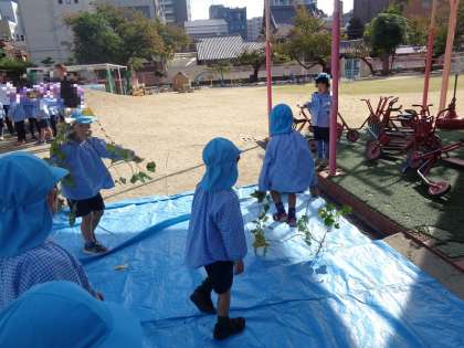 ツルを引っ張り、出てきたのはいろいろな形のサツマイモ! 小さいものから大きいものまで沢山収穫することができましたよ。並べて形を比べたり、長いツルを使って縄跳びをしたり、綱引きをしたり…。サツマイモをじっくりと観察する様子もありました。