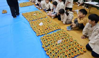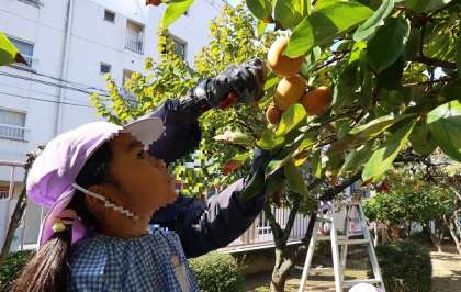 幼稚園の前庭で、大きくて立派な柿を幼稚園のみんなで収穫しました。遊戯室に全部集めて年長児で柿の数を数えました。子どもたちはただひたすら並べていましたが、数を数えるのによい方法はないか、投げかけてみました。まずは、「10個ずつにしよう」という声があがりました。それでもわからなくなるくらいたくさんの柿に困っていると、「次は、10個を10ずつ集めてみたら」「それって100個やで」という会話に「おぉ」と驚く先生たち。100個の集まりが、6つと10個になり、全部で「610個」収穫できました。